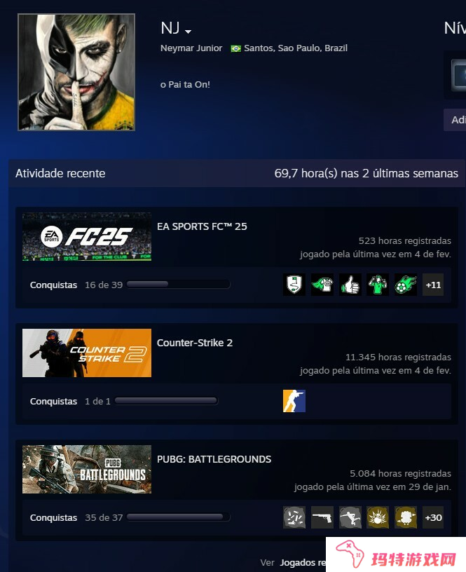 作为资深CS爱好者,巴西足球巨星内马尔在CS游戏中时长已超过11000小时。根据Steam上的公开数据,内马尔最后一次登录游戏是在本周一(2月3日),目前游戏时长已突破11000小时(11345h)。FC25总计523小时,PUBG一共玩了5084小时。