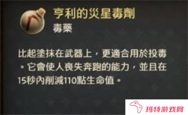 效果:灾星毒药的伤害非常高,涂抹在武器或箭矢上后,敌人在中毒后会快速死亡,通常在5秒内就会毙命。这使得它非常适合在暗杀或单挑时使用,迅速结束战斗。