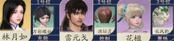 万彩蝶妖:主要负责充能,为队伍提供持续的能量支持。由于林月如的大招能量越高,提升效果越大,因此需要万彩蝶妖来弥补充能上的缺口。