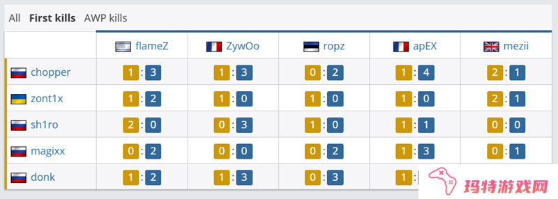 在全部对位数据上,我们可以看到一个夸张的数据:ZywOo 24-2 chopper。ZywOo对位Spirit的所有队员都不处于下风,除了与magixx战成8-8平外,其他人都没能与ZywOo抗衡。Spirit的明星选手donk只在与flameZ的对决中占据优势,其他都是战平或处于劣势。