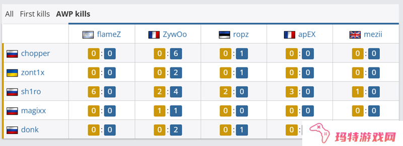 在首杀方面,ZywOo取得9个首杀,与flameZ、apEX并列第一。donk则取得了7个首杀。magixx只有一个首杀入账。
