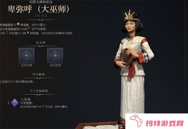 +20%文化值但-10%科技值:在没有庆典的情况下,卑弥呼的文化会有所提升,但科技会受到一定的削弱。庆典期间,这种文化增益会翻倍。这个特点使得卑弥呼专注于文化和幸福值,适合追求文化胜利。