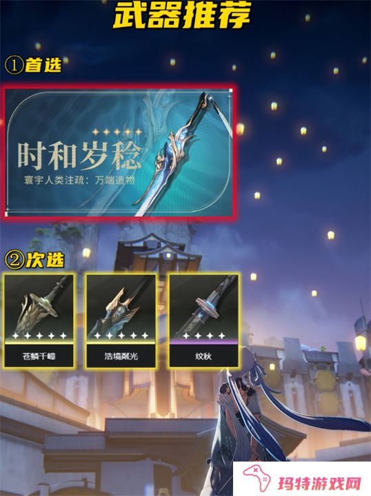 最适合今汐的肯定是她的专武【时和岁稔】,如果没有专武的玩家可以参考下图中的次选武器。