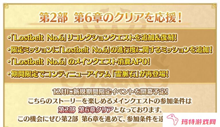 新的限时活动将于 12 月开始。参加条件是通关第二部第六章“异闻带第六章妖精圆桌王国阿瓦隆·勒·菲,星辰诞生之时”。