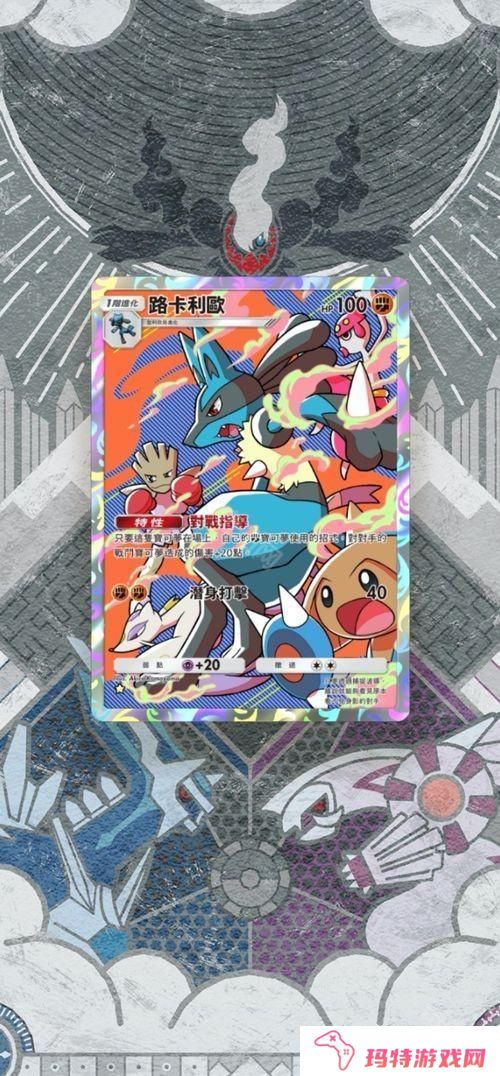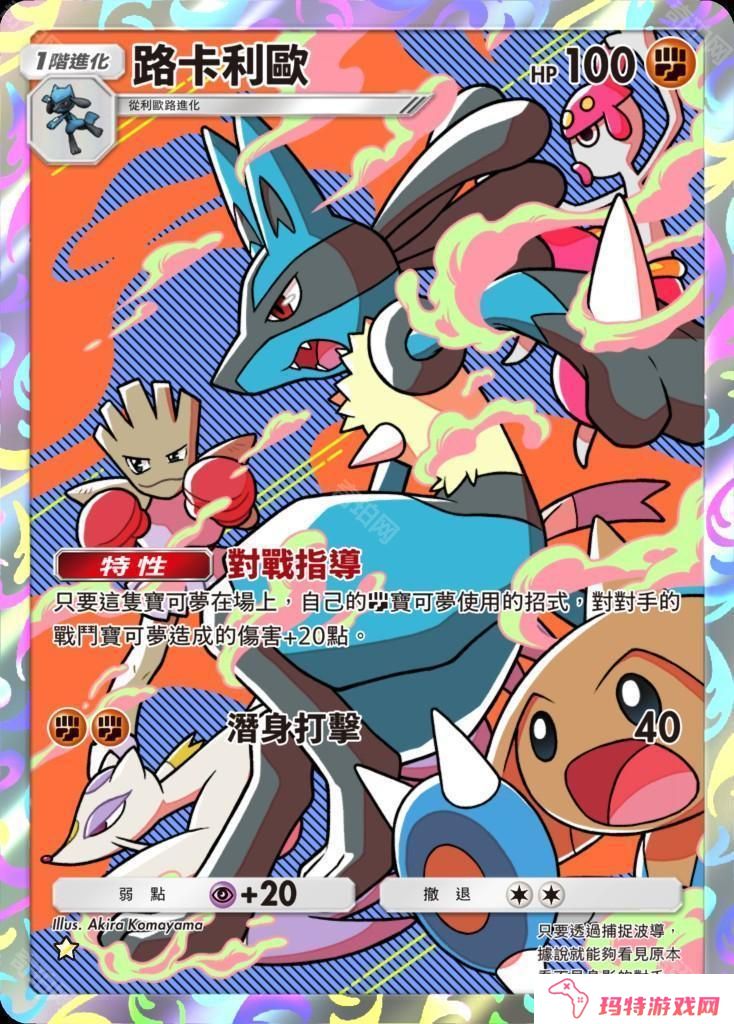 路卡利欧像是在前头引领着其他宝可梦一般,富有动感且流行又缤纷的插画是这张卡牌的独特之处。