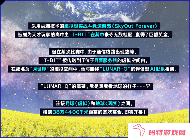 被誉为天才玩家的高中生“T‐BIT”,豪夺无数桂冠,赢得巨额奖金。 但在某次比赛中,由于通信线路出现故障,“T‐BIT”被传送到了位于月面服务器的虚拟空间内。 在那名为“月世界”的虚拟空间中,他与自称“LUNAR‐Q”的伴侣型AI形象相遇。 跨越地月之间38万4400千米距离的悲欢离合,即将开幕!