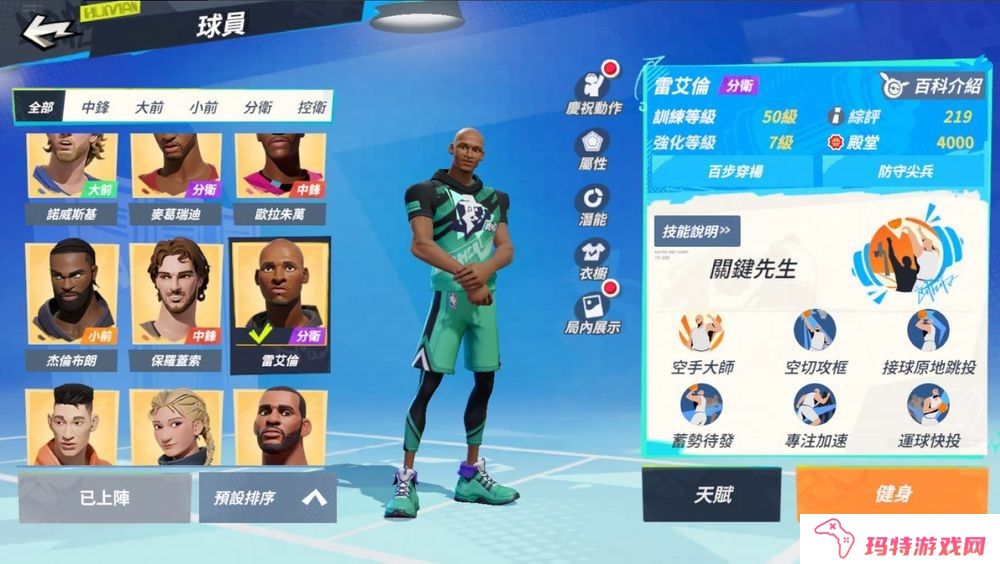 空手大师:移动速度额外增加并增加安全接球距离,且底线可以快速跑位。加速状态下,雷艾伦拿到进攻篮板、完成得分、篮下 3 公尺内成功抢到进攻地板球时加速技能将立刻完成冷却。