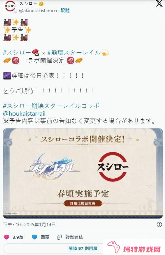日本回转寿司店「寿司郎(あきんどスシロー)」2025年1月14日宣布,将与银河冒险策略 RPG《崩坏:星穹铁道》(PC / PS5 / PS4 / iOS / Android)在日本地区展开合作,预计将于 2025 年春季实施,将于日后发表详细合作情报。