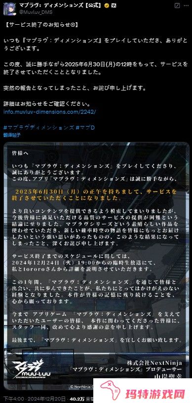 《MUV-LUV DIMENSIONS》宣布将于2025年6月30日停服 在12月24日的直播中公布未来规划《MUV-LUV DIMENSIONS》宣布将于2025年6月30日停服 在12月24日的直
