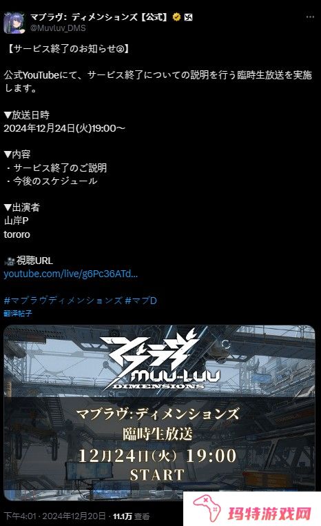 此外,官方预计于 2024 年 12 月 24 日(二)透过 YouTube 举办直播,说明此次终止服务的经过以及今后的规划。