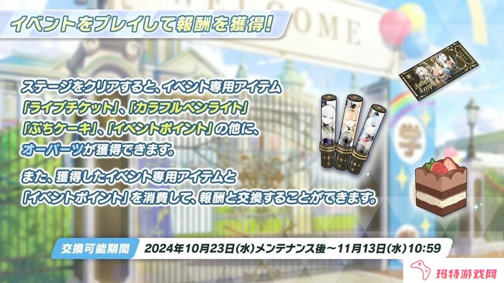 通关活动 Stage 时,除了可获得「演唱会门票」、「七彩手灯」、「小蛋糕」、「活动点数」等活动专用道具外,还能获得欧帕兹。玩家可使用上述道具及点数,至活动商店兑换各种道具。
